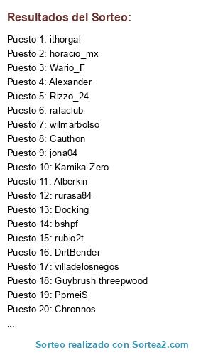 Lista de participantes: Suhailo, ithorgal, Wario_F, Chronnos, villadelosnegos, DirtBender, rafaclub, yamiboy, wilmarbolso, horacio_mx, rubio2t, Cauthon, [CAT] ToTTi, rurasa84, bshpf, Alaf, Kamika-Zero, Chacho, MigueLFg, Docking, PpmeiS, buckillo, Alberkin, Hans Topo, Jamopa, Rizzo_24, Alexander, jona04, Jotasct, Guybrush threepwood.