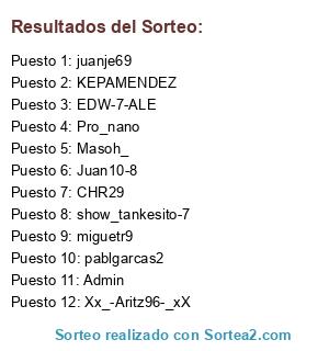 Lista de participantes: Admin, Xx_-Aritz96-_xX, KEPAMENDEZ, pablgarcas2, miguetr9, juanje69, CHR29, Pro_nano, Masoh_, show_tankesito-7, Juan10-8, EDW-7-ALE.