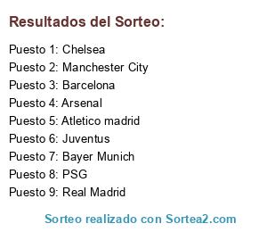 Lista de participantes: Bayer Munich, Chelsea, Manchester City, PSG, Atletico madrid, Real Madrid, Barcelona, Juventus, Arsenal.