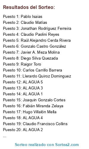 Lista de participantes: Carlos Carrillo Barrera, Carlos D Muñoz, Claudio Francisco Collins, Claudio Matías, Claudio Paolini Reyes, Diego Silva Quezada, Fabián Miranda Zelaya, Felipe Ignacio, Gonzalo Castro González, Guillermo Caro, Hugo Villalón Mella, Javier A. Meza Molina, Joaquin Gonzalo Cortes, Jonathan Rodríguez Ferreira, Jorge Andrés S. Oliva Ramos, Llerardo Quiroz Dominguez, Matías Pardo, Pablo Isaias, Raigor Toro, Raúl Alejandro Cerda Rivera, AL AGUA 1, AL AGUA 2, AL AGUA 3, AL AGUA 4, AL AGUA 5.