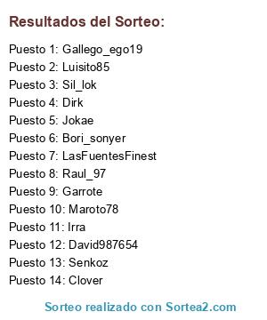 Lista de participantes: Irra, David987654, LasFuentesFinest, Maroto78, Garrote, Luisito85, Dirk, Clover, Sil_lok, Senkoz, Bori_sonyer, Gallego_ego19, Jokae, Raul_97.