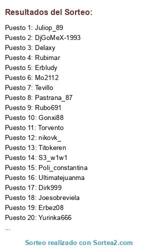Lista de participantes: Erbez08, Rubimar, Donaire, Abramstaff, Delaxy, DjGoMeX-1993, JesuMl, aziz_miring, Javioss28, S3_w1w1, Pastrana_87, Xou86, Tevillo, Elreyelfo, Mo2112, Erbludy, Nilsson, Ultimatejuanma, Rubo691, Dirk999, Fjmesa21, Torvento, Albertomartinc, nikovk_, Poli_constantina, Yurinka666, Titokeren, Juliop_89, Aquiles0686, Joesobreviela, Gonxi88, Kivain85.