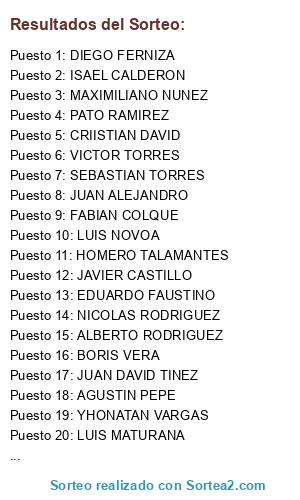 Lista de participantes: FHRANN ALEX, TOMAS OLEA, MIKHELE GRIMALDOS, PEPE PEREZ, SEBASTIAN ALEJANDRO, JUAN ALEJANDRO, JUANJOSE SEPULVEDA, FABIAN COLQUE, NICOLAS AROCA, JAVITO ANDRES, MATIAS MEDRANO, YHONATAN VARGAS, CRIISTIAN DAVID, PABLO LATORRE, MAXIMILIANO NUNEZ, NICOLAS RODRIGUEZ, LUIS NOVOA, ANDRE STRELLO, SEBASTIAN FIGUEROA, LUIS HERNANDEZ, FABIAN ET, HOMERO TALAMANTES, GERARDO LOPEZ, JAVIER CASTILLO, JOSE LUIS GARCIA, LEONARDO JULIO, ALBERTO RODRIGUEZ, RICHARD DOMINGUEZ, JUAN PABLO DUARTE, JUAN DAVID TINEZ, PABLO MA, DIEGO FERNIZA, SERGIO NICOLAS, LUIS MATURANA, ISAEL CALDERON, VICTOR TORRES, AGUSTIN PEPE, SEBASTIAN TORRES, EDUARDO FAUSTINO, MIGUEL CALVILLO, NIKOLAI ANDRE, PABLO IGNACIO, FROYLAN JIMENEZ, J ALBERTO BELENDEZ, PATRICK VILLAGRAN, FERNANDO OSCAR, MIGUEL FCB RUIZ, ALEX MARCELO, DIEGO TORRES, DIEGO VIDAL, MARCOS JONATHAN, MAURICIO ZAMBRANO, PATO RAMIREZ, BORIS VERA.