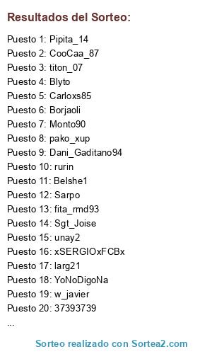 Lista de participantes: Ab-17, Borjaoli, Nemesis_aCr, Belshe1, Sgt_Joise, CooCaa_87, Gerstation2009, Keko_16_cr9, Sarpo, 37393739, Blyto, junior_jhon6, Josu_05, Thewindforce, Kapivo, Monto90, Pipita_14, rafita011385, fita_rmd93, titon_07, roan47, unay2, camara81, keresusdcl, Dani_Gaditano94, Carloxs85, pako_xup, w_javier, xSERGIOxFCBx, larg21, rurin, YoNoDigoNa, .