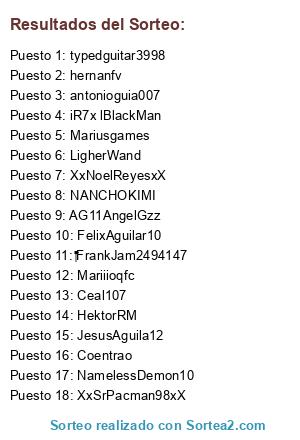 Lista de participantes: Ceal107, JesusAguila12, LigherWand, HektorRM, FrankJam2494147, XxNoelReyesxX, Coentrao, AG11AngelGzz, antonioguia007, Mariusgames, hernanfv, NamelessDemon10, iR7x lBlackMan, NANCHOKIMI, XxSrPacman98xX, typedguitar3998, FelixAguilar10, Mariiioqfc.