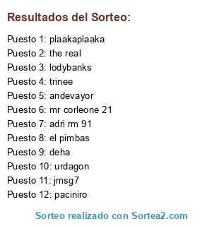 Lista de participantes: andevayor, plaakaplaaka, jmsg7, deha, adri rm 91, the real, trinee, mr corleone 21, paciniro, lodybanks, el pimbas, urdagon.