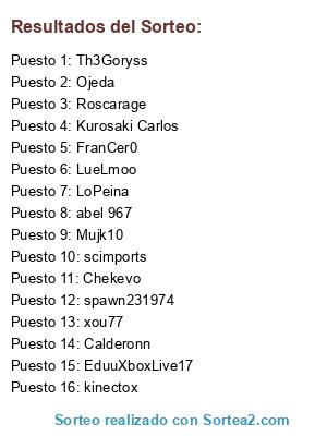 Lista de participantes: Chekevo, Kurosaki Carlos, Roscarage, xou77, LoPeina, EduuXboxLive17, abel 967, FranCer0, Ojeda, Mujk10, LueLmoo, spawn231974, Th3Goryss, kinectox, scimports, Calderonn.