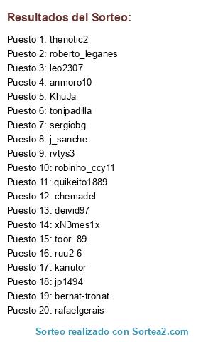 Lista de participantes: rvtys3, chemadel, ruu2-6, anmoro10, thenotic2, leo2307, sergiobg, kanutor, bernat-tronat, KhuJa, quikeito1889, tonipadilla, robinho_ccy11, roberto_leganes, toor_89, rafaelgerais, jp1494, xN3mes1x, j_sanche, deivid97.