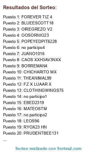 Lista de participantes: THE MISTER HZ, MATEOSTM, CLOTHINGWINGS75, THEANIMAL99, POPEYEDPIT6228, JUANO1016, CAOS XXH3AV3NXX, BORREMAN4, PRUDENTBEE131, CHICHARITO MX, FOREVER TIZ 4, PANICJX, OOSORNIO23, OlREGREZO V2, LEOS96, FZ X LUAAR X, BLUEESCOTT18, EBED2319, SAMUELZATA, RYOX23 HN, no participo1, no participo2, no participo3, no participo4.