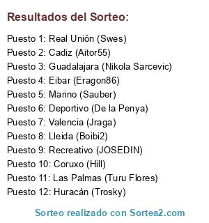 Lista de participantes: Cadiz (Aitor55), Coruxo (Hill), Deportivo (De la Penya), Eibar (Eragon86), Guadalajara (Nikola Sarcevic), Huracán (Trosky), Lleida (Boibi2), Las Palmas (Turu Flores), Marino (Sauber), Recreativo (JOSEDIN), Real Unión (Swes), Valencia (Jraga).