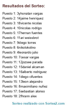 Lista de participantes: 1diego cifuentes, 2fhrann alex, 3yhonatan vargas, 4leonardo julio, 5sebastian alonso, 6nikolokolino, 7cesar vargas, 8maximiliano nuñez, 9diego torres, 10nicolas rodrigo, 11ari weissbrot, 12jozsee parada, 13leon alejandro, 14jaime henriquez, 15daniel alcaman, 16alberto rodriguez, 17hernan fuentes, 18vicente nicolas.
