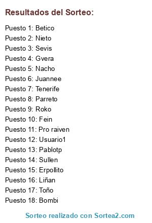 Lista de participantes: Pablotp, Juannee, Erpollito, Betico, Bombi, Fein, Gvera, Nacho, Parreto, Pro raiven, Roko, Sevis, Tenerife, Toño, Nieto, Sullen, Liñan, Usuario1.