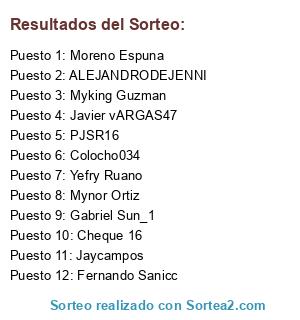 Lista de participantes: Javier vARGAS47, Colocho034, Moreno Espuna, Fernando Sanicc, Yefry Ruano, Jaycampos, PJSR16, Gabriel Sun_1, Myking Guzman, Mynor Ortiz, Cheque 16, ALEJANDRODEJENNI.