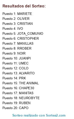 Lista de participantes: PRK, MANILLAS, IVO, JOTA_COMUNIO, UMEC, NOIR, RROBER, JUANPI, CRISTOPHER, NEUROBYTE, CAPO, MANITAS, THE ANIMAL, CRISTIAN, OLIVER, CHAPE30, ALVARITO, COLO, RUBEN, MARIETE.