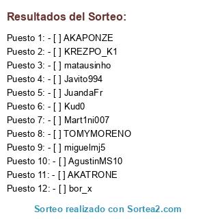 Lista de participantes: - [ ] miguelmj5, - [ ] KREZPO_K1, - [ ] Javito994, - [ ] bor_x, - [ ] Kud0, - [ ] TOMYMORENO, - [ ] AKATRONE, - [ ] Mart1ni007, - [ ] matausinho, - [ ] AgustinMS10, - [ ] JuandaFr, - [ ] AKAPONZE.
