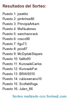 Lista de participantes: Scofieldfuga, Julen_86, pintinhos80, KurosakiCarlos, McDydakSlayers, KurosakiFer, falillo90, poio87, josetito, figu73, cosco90, MaNualonso, sanchezcrack, PrincipeArkam, BRAIS010, rubioserrano10.