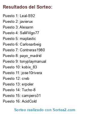 Lista de participantes: Alesann, campero31, Leal-S92, payo_madrid, creb, maplastic, kobix_83, jose10rivera, javierux, Contreras1980, AcidCold, Tucho-8, SaMVigo77, Carlosarbeig, tonyplaymanual, erpoler.