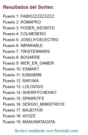 Lista de participantes: JOSELIYOELECTRO, ESMART, AYOZE, BOGARDE, COLMENERO, IMPARABLE, ROMAPRO, LOLOVIGO, MAJEITOR, MANUWATAGATA, FABIOZZZZZZZZZ, TWISTERWARS, PODER_NEGRITO, RAFUKA, SPAWNTFE, WER_ER_GAMER, SERGIO_MIMISTRO10, SHERIFFCHENKO, 625608895.