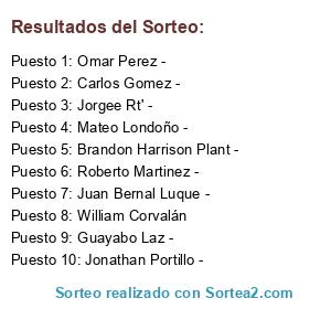 Lista de participantes: Jorgee Rt' -, Mateo Londoño -, Roberto Martinez -, Juan Bernal Luque -, Guayabo Laz -, Brandon Harrison Plant -, Jonathan Portillo -, Omar Perez -, Carlos Gomez -, William Corvalán.