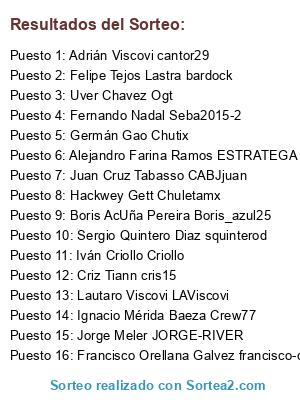 Lista de participantes: Juan Cruz Tabasso CABJjuan, Adrián Viscovi cantor29, Uver Chavez Ogt, Lautaro Viscovi LAViscovi, Hackwey Gett Chuletamx, Felipe Tejos Lastra bardock, Germán Gao Chutix, Boris AcUña Pereira Boris_azul25, Criz Tiann cris15, Alejandro Farina Ramos ESTRATEGA, Iván Criollo Criollo, Francisco Orellana Galvez francisco-cabj, Ignacio Mérida Baeza Crew77, Fernando Nadal Seba2015-2, Juan Carlos Soto JuanKStigma, Jorge Meler JORGE-RIVER.