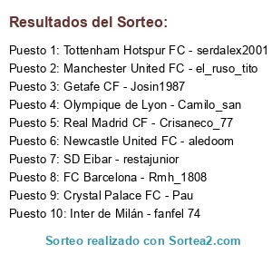 Lista de participantes: Crystal Palace FC - Pau, Newcastle United FC - aledoom, Real Madrid CF - Crisaneco_77, Getafe CF - Josin1987, Tottenham Hotspur FC - serdalex2001, SD Eibar - restajunior, FC Barcelona - Rmh_1808, Inter de Milán - fanfel 74, Manchester United FC - el_ruso_tito, Olympique de Lyon - Camilo_san.