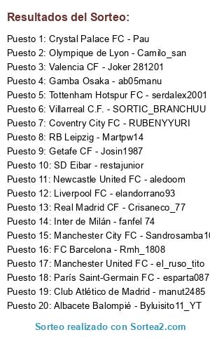 Lista de participantes: Albacete Balompié - Byluisito11_YT, Club Atlético de Madrid - manut2485, Coventry City FC - RUBENYYURI, Crystal Palace FC - Pau, FC Barcelona - Rmh_1808, Gamba Osaka - ab05manu, Getafe CF - Josin1987, Inter de Milán - fanfel 74, Liverpool FC - elandorrano93, Manchester City FC - Sandrosamba10, Manchester United FC - el_ruso_tito, Newcastle United FC - aledoom, Olympique de Lyon - Camilo_san, París Saint-Germain FC - esparta087, RB Leipzig - Martpw14, Real Madrid CF - Crisaneco_77, SD Eibar - restajunior, Tottenham Hotspur FC - serdalex2001, Valencia CF - Joker 281201, Villarreal C.F. - SORTIC_BRANCHUU.