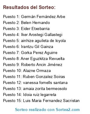 Lista de participantes: Aner Eguzkitza Revuelta, Eider Etxebarria, Roberto de blas quevedo, Juan Carlos Sánchez Ortiz, aritz galdos emaldi, Ruben Gonzalez Soiras, Luis Maria Fernandez Sacristan, Martín leal monroy, Argiñe Olaguenaga Mojas, irene mendia eizaga, vanessa fornells santana, aitor bereziartua alberdi, Maider Torre Areitio, Kalare Oraá González, Joseba Etayo Iturri, Juan Manuel Martçin Echevarría, Joseba Larizgoitia Akesolo, Amaia Isasi Sagastizabal, Igor pascual, ion iturbe zabalo, Zuhaitz Rodriguez Uribesalgo, Josu Uranga Arotzena, Miguel angel perez bravo, Amaia Campo López de Luzuriaga , Roberto Ancin Jiménez , eritz sayar puente, José Ignacio alonso portuondo, Janire arias salas, Belen Hernando , Josema huizi oroz, amaia zorita bermeosolo, Begoña Bayer Crespo, Idoia ruiz legarreta, Elena Morales Garcia, Irune Laiseca Bilbao, Lainoa Bilbao, Ana Güezmes Güezmes, iker aguero esteban, Iñaki Garcia Rivas, Germán Fernández Arbe, Joana Gerrikabeitia , Patricia Fernández Fernández , Sara hospital, JONE ZENON , jon ander agirre uriarte, Kristina Gorostidi Salinas, Javi Estarrona Armentia, Irantzu Gil Gainza, ainhize aguileta de loyola, Euken Allika Zabalbeaskoa, Jagoba Ugarte Ibargaray, Alazne Ormaza, Elisabete. Etxegarai, Feli Gil Davila, Idoia Cabrera Muñoz, Itxaso ocerin , Eduardo Martinez Nuño , Laura Fernández Requena, Alaitz Basterra Ituiño, Nagore Martínez López, Iker Arostegi Gallastegi, Maitane Landa Aperribai, Anartz Goiriena Zilloniz, dani emaldi, Jon Basaldua Mollinedo, Gorka Perez Aguirre.