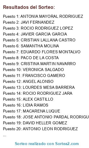 Lista de participantes: ANA CORAL GORDO LÓPEZ, CURRO PIÑA BAENA, JULIÁN NAVARRO, DAVID GUERRA, JOSE LUIS MOLINA, ALFONSO RODRIGUEZ DIAZ, JOSE CARLOS GONZALEZ GARCIA, JOSE MANUEL CONDE CORDERO, LORENA GONZALEZ SACRAMENTO, ROCIO RODRIGUEZ JARA, VERONICA SALGADO, NENA HOLA HOLA, MIGUEL ANGEL RANGEL GONZALEZ, LUZ MARIA REBOLLO VILLARAN, MARIA JOSE ABAD, CARLOS ANDRES MARCHENA, CAROLINA MORA EXPOSITO, JAVI AGRCIA PEREZ, ROSA MARIA RAMIREZ TENORIO, CARLOS RUIZ MANZANO, ROSARIO MACIAS POLVILLO, JOSE ANGEL BUSTOS OLMEDA, SAMIRA MOKADDEM LEMAGHI, SERGIO HIDALGO RODRIGUEZ, MANUEL TAVORA SANCHEZ, MANUEL PALMA BARQUILLA, CARMEN VALDIVIA VALLE, JOSE MANUEL RECIO RIVERO, MARIAN LOPEZ GUIJARRO, ALBERTO LUQUE GUIJARRO, YOLANDA GARCIA REY, GABRIEL SANCHEZ PORTO, JUAN VERDUGO MUÑOZ, SANDRA MADRONA, ALEJANDRA RUIZ, JUAN MIGUEL VAZQUEZ ALANIS, LUIS JESUS RUIZ ORTIZ, JESUS ESCAÑO INFANTE, ANTONIO CARDENAL, CARLOS CHECA, MIGUEL ANGEL FERNANDEZ RODRIGUEZ, JESUS EL CHECHU, JOSE LUIS MARTIN NIETO, CARLOS SALGADO ESPINO, RICARDO NOGALES BARRERA, ANTONIO PRIETO, SERGIO CAMPOS CIDES, VIRGINIA RODRIGUEZ, JORGE VAZQUEZ PACHECO, ALVARO OLIVERO GARCIA, DAVID HELLER GOMEZ, ROCIO PEREZ FLORES, JOSE ANTONIO GARCIA PULET, FERNANDO PEREZ, MANU PEREZ, DANIEL SANCHEZ, LORENA RAFFO LOZANO, ALEXANDER ZIDANE, ELVIRA PEREZ, JOSE MANUEL CEBALLOS JIMENEZ, BELEN GARCIA CUEVAS, ANTONIO RUBIO GOMEZ, VANESA MORENO ATERO, WALTER ZUIDERG, JAIRO MUÑOZ, JAVIER BLANCO, FRANCISCO GAMERO, ANTONIO MANUEL FDEZ LAY, OSKITA SEVILLISTA, ALVARO ROMERO PASTOR, ALBERTO BOZA LOBATO, ANTONIO OJEDA GORDILLO, JESUS GRANADOS SANCHEZ, PEDRO GUTIERREZ VALDIVIA, IRENE LOPEZ, ISABEL RODRIGUEZ VELA, MARI CARMEN RODRIGUEZ GIL, JOSE MANUEL FERRERO GUTIERREZ, JUAN ANTONIO MELERO VERDUGO, EDUARDO FLORES MONTALVO, ANA ROSA GAGO PUERTO, JUAN CARLOS DELGADO, JUSTA GAGO PUERTO, JAVIER LOPEZ, JESUS GOMEZ ATANASIO, MARIA RAMOS, MARTITA DEL RIO, ANGEL PLAZUELO SEGURA, MARIO ROMAN, PABLO CAMACHO, MI BUHITO, JUAN ANTONIO ASENCIO, INMA GARCIA GUILLEN, LOLI GARCIA DOMINGUEZ, NOELIA CHACON, MACU CORTES FERNANDEZ, JUANMARCOS RODRIGUEZ MARTINEZ, ALEJANDRO ALVAREZ GARRIDO, INMA TORRES, LAURA CARRASCO, ANTONIO ORTEGA RODRIGUEZ, CARLOS JESUS GONZALEZ TORRALBA, FRANCISCO JAVIER FRACO LOPEZ, JUANITO CRIADO MORENO, CRISTIAN LALLANA CASTRO, MARIA DEL MAR BARRAGAN, ISABEL TEJERO FALCON, CAROLINA BENITEZ, JOSE GUERRA GARCIA, MIRLI DOMINGUEZ, ROSA GONZALEZ PORTILLO, JOSE MANUEL CRESPO DOMINGUEZ, ANA GARCIA DOMINGUEZ, ROCIO JAEN GONZALEZ SAENZ, SARA MUÑOZ, JOSE MANUEL BERRIO, JOSE L. DIEGUEZ GARCIA, DAVID ESPINA LOPEZ, NOELIA SEISDEDOS OLMO, ALVARO VILLANUEVA SANTOS, MARTA GIL, ALVARO SANCHEZ MORALES, JM CM, ANTONIO QUINTERO MACÍAS, CRISTINA MARTIN NAVARRO, VERONICA GOMEZ, MARILO SUAREZ LOPEZ, ANITA VAZKEE, SARAY DOMINGUEZ VASCO, MARIA JESUS ALANIS AGRCIA, ANA PAVON PEREZ, JESUS GIL RAMIREZ, LAURA REDONDO MALPARTIDA, SONIA ORTIZ, DANIEL RODRIGUEZ REYES, CAROLINA ALONSO, IGNACIO CAMPOY, SARA CARRASCODIAZ, ANTONIO RODRIGUEZ SUAREZ, JERY THEBEST, MARIA ALVAREZ GARCIA, IVAN PARRA RUIZ, CRISTINA SANCHEZ NUÑEZ, JESSICA NOVOA GONZALEZ, LALI FDEZ, CAROLINA LUGO CARVAJAL, FRANCIS ALANIS, ERNESTO DORASO GARAMENDI, ISABEL LOPEZ ALCAIDE, CURRO VELASCO, INMACULADA CUMBRERAS RODRIGUEZ, MATIAS GARCIA SANCHEZ, DORI OSUNA OTERO, PACO DE LA COSTA, JOAQUIN TOUS RIVERA, BEA LB, RAQUEL VALDIVIA, RUTH JIMENEZ VALDIVIA, RITA ANGUIANO CARRION, GRUPO FORMALEARN, TERESA GARCIA, ALICIA GONZALEZ AYALA, KARPINYNIEVES MARTINEZ DIAZ, MAR OLIVEROS, LUZ MARIA ROMERO VARELA, EDUARDO MIGUEL GONZALEZ ALONSO, JUANI GARRIDO MORENO, LUPE GONZALEZ, SONIA SANCHEZ RODRIGUEZ, JOSE OJEDA CODESEDA, PEDRITO OLMEDO GARCIA, BORJA ROCAFULL CHESTERFIELD, ANA RUIZ MUÑOZ, MARI PAZ BUJALANCE PULIDO, PACO BERNETE, FRANCISCO ANGEL MARQUEZ RUIZ, MANUEL NOSALPIQUES, ZOILO FERNANDEZ DELGADO, ELENA HOYOS, JESUS SANCHEZ, PILAR OLIVER, ISMAEL MORALES JIMENEZ, ADRIAN GARCIA CAMPOS, LIDIA RAMOS, ALEJANDRO MUDARRA HERRERA, DEVORAH CRUZ, ANTONIA MAYORAL RODRIGUEZ, FATIMA GONZALEZ MONTES, CRIS SANTOS, CARLOS CLSA, IVAN IÑIGUEZ, SELUYTATI NIEVES RODRIGUEZ, MANOLO CARO ÑUNOZ, DAVID GARCIA, MACARENA LUQUE, NATALIA DOMINGUEZ LARA, OSCAR GARCIA PEREZ, VIOLETA RODRIGUEZ, RAQUEL BARRERO GALVAN, ROCIO RODRIGUEZ LOPEZ, JONY GODE, JAVIER GARCIA GARCIA, MARI CARMEN ROBLES RAMIREZ, ANTONIO RODRIGUEZ GARCIA, SAMANTHA MOLINA, JUANMA RIVERO CORNEJO, JOSE MANUEL MORENO JIMENEZ, PEPI REAL RODRIGUEZ, FRANCISCO JESUS ROMERA PISONES, INMA TEBAR GARCIA, MARICELY CAMACHO ARIAS, ERIKA SOBRINO BARRERA, LALE RUIZ LORA, SONIA MILLAN MOLINER, FRANCISCO MANUEL OJEDA DURAN, JUAN MANUEL PEREA, MARIA ISABEL DE BESA, LUCIA ESTUDILLO VALENCIA, MARIANA NEGRETE NAVARRO, BELEN RODRIGUEZ RINCON, LEONOR MOYANO TORRES, ANGELA ESPINOSA CABAÑAS, ROCIO VIZCAINO PEREZ, PEDRO LOPEZ ZAJARA, LOURDES VALBUENA FRANCISCO, MARIA JESUS VALENCIA ARAGON, BEATRIZ CASTAÑO, JUAN PEDRO URRACA PEREZ, HUCA MORENO ESPERANCI, JOSE GRANADERO SAYAGO, MANUEL LOZANO REBOLLO, CARLOS CORPAS, RAFAEL PEREZ ROMERAS, DAMARIS RODRIGUEZ ROMERO, ANTONIO LEON RODRIGUEZ, JOSE ESCOBAR, M ANGELES OLIVER, CESAR COELLO, FERNANDO GONZALEZ DEL AGUILA, M CARMEN OVIEDO AGUILAR, MARINA GUERRERO, AZUL MORENO HISADO, AUXI CALERO, MIGUEL ANGEL NUÑEZ MARTOS, ISA CRUZ ESTEVEZ, MCARMEN ALCALDE LOPEZ, FRANCISCO KIKI, ANGEL ALONSO, ESTELA ESCUDERO, ISABEL BAREA, JOSE MARI PEREZ RODRIGUEZ, JUAN MELGUIZO, MANUEL ARISCAL GARCIA, LUIS MORON, RUBEN KELPYEND PAZ KIBINDA, JESUS PEREZ, JOSE ANTONIO PARDAL RODRIGUEZ, ROSA ROSENDO PONCE, RUBEN ROLDAN LOPEZ, MILA CASTRO GOMEZ, MARINA REPOSTERA, NEREA PUNTAS CORTES, ALBERTO VERDUGO PEREZ, JESUS MUÑOZ, BEATRIZ VERDUGO PEREZ, MANUEL CAMPOS VILLALTA, ALEGRIA GOMEZ, ALVARO GALLO, JESSICA RINCON ROJAS, REYES GARCIA, SERGIO ACAL PIÑERO, JUAN ANTONIO DELGADO, PIPICAN BORMUJOS, FRANCISCO RUIZ GALLEGO, JAVI DUARTE QUESADA, JUAN BAUTISTA ALVAREZ SANCHEZ, MARIA JOSE GUERRERO CABELLO, ALEGRIA MORENTE, JUAN ALBERTO VILLAGRAN GUERRERO, JESUS BALLESTEROS PALACIOS, ANTONIO LARA PEDROSA, DANIEL MUGURUZA, D