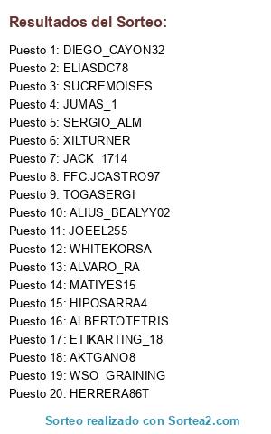 Lista de participantes: XILTURNER, ALIUS_BEALYY02, DIEGO_CAYON32, ETIKARTING_18, WSO_GRAINING, WHITEKORSA, JOEEL255, HERRERA86T, JUMAS_1, ALVARO_RA, ALBERTOTETRIS, TOGASERGI, SERGIO_ALM, MATIYES15, FFC.JCASTRO97, ELIASDC78, HIPOSARRA4, SUCREMOISES, AKTGANO8, JACK_1714.