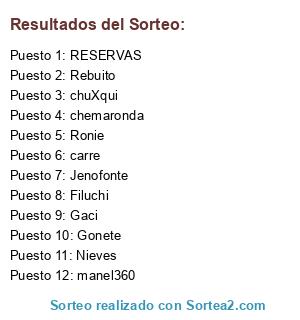 Lista de participantes: chuXqui, Ronie, Nieves, chemaronda, manel360, carre, Gonete, Gaci, Filuchi, Rebuito, Jenofonte, RESERVAS.
