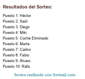 Lista de participantes: Álvaro, Marta, Héctor, Saúl, Diego, Rafa, Carlos, Miki, Fabio, Coche Eliminado.