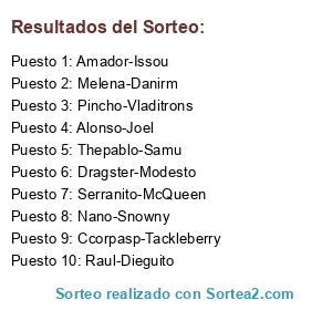 Lista de participantes: Nano-Snowny, Serranito-McQueen, Alonso-Joel, Ccorpasp-Tackleberry, Pincho-Vladitrons, Melena-Danirm, Thepablo-Samu, Amador-Issou, Raul-Dieguito, Dragster-Modesto.