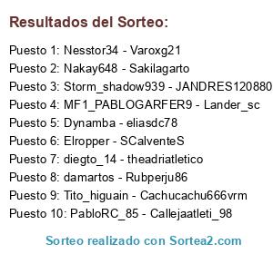Lista de participantes: damartos - Rubperju86, Dynamba - eliasdc78, Storm_shadow939 - JANDRES120880, Nesstor34 - Varoxg21, PabloRC_85 - Callejaatleti_98, MF1_PABLOGARFER9 - Lander_sc, diegto_14 - theadriatletico, Nakay648 - Sakilagarto, Tito_higuain - Cachucachu666vrm, Elropper - SCalventeS.