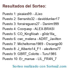 Lista de participantes: Ccorpasp - ALEX-BRASI, fonsireguero27 - Danirm999, pixaias99 - JLixo, J_Alberto14_F1 - alexferre77, Micheltorres1989 - Oscargp00, GBRT_Colotto - Turu1985, CO_KingNoah - g0dz1lla_, Serranito32 - daviddunker17, Er_manue - LIL_FR4N_7, cwc_melena - ADRT_Javilton.