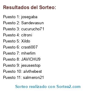 Lista de participantes: alvthebest, citroni, crasti007, cucurucho71, JAVICHU9, jesusestop, josegaba, mherlim, salmeron21, Sandevasun, Xildo.
