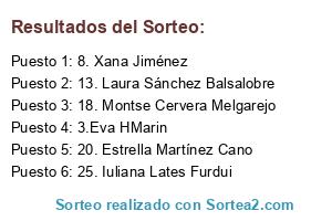 Lista de participantes: 1. Ana Nicolás Abellán, 2. Sonia Gombau Novo, 3.Eva HMarin, 4.Mangeles Martínez García, 5. Raquel García Villescas, 6. David Moisés Juan Tenza, 7.Virginia Sánchez, 8. Xana Jiménez, 9. Carmen García Martínez, 10. Rosa Cárceles González, 11. Angeles Cano, 12. Natalia Coll, 13. Laura Sánchez Balsalobre, 14. Gema Manzano Arroyo, 15. Teresa Fernández González, 16. Raquel Sánchez López, 17. Carolina García Armero, 18. Montse Cervera Melgarejo, 19. Cristina Muñoz Sabater, 20. Estrella Martínez Cano, 21. Olga Lucía Botero Giraldo, 22. Alicia Cano García, 23. Amparo Lorca Muñoz, 24. Noelia Vallejos, 25. Iuliana Lates Furdui, 26. Ana García Macas.