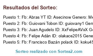 Lista de participantes: Fb: Reynaldo HD ID: rey1005 Genero: Men, Fb: Jhonatan David ID: vinchis Genero: Men, Fb: Juan Pablo Perea ID: xlxnikos1xlx Genero: Men, Fb: Jose Oliveros Weed ID: jhoango Genero: Men, Fb: Julian Riaño ID: XxGneralJefM79xX Genero: Men, Fb: JrLarry Larry ID: YoSoyLarryS2 Genero: Men, Fb: Maicol Contreras ID:mamaselsa321 Genero:Men, Fb: Yeremy Cerda ID: octa65 Genero: Men, Fb: Julio Vargas ID: monster1004 Genero: Men, Fb: Azocar Hecmill ID: HellGod Genero: Men, Fb: Emily Vanegas ID:EmilyVanegas Genero:Woman, Fb: Luis David XD ID: xdluizzxd Genero: Men, Fb: Stewart Quiroz ID: stewartxxx Genero: Men, Fb: Ronnie Perez ID: rpg04 Genero: Men, Fb: Victor Palencia ID: checosnet11 Genero: Men, Fb: Jhonatan Restrepo ID: chotanx Genero: Men, Fb: Felipe Adán ID: olakace2015 Genero: Woman, Fb: Sebastian Martinez ID: lunatico108 Genero: Men, Fb: Tinelly Tinelly ID: tinelly Genero: Men, Fb: Ciro Axeso ID: jacaroooo1 Genero: Men, Fb: Striker Aod ID: xXstrikerXx1 Genero: Men, Fb: Paolo Arancibia Nick: iSrProMac Genero: Men, Fb: Geomer ID: xFBPx Genero: Men, Fb: Jonathan Axeso ID: Jonathanl1 Genero: Men, Fb: Alejandro Barron ID: Colomaster15 Genero: Men, Fb: Guiovani Tobon ID: guiovany1 Genero: Men, Fb: RM Monges ID: anakin Genero: Men, Fb: Cris Giovagnoli ID: seji9888 Genero: Men, Fb: Juan Agudelo ID: XxFelipeAVxX Genero: Men, Fb: Simon Pardo ID: simonpardo09 Genero: Men, Fb: Carlos Daniel GC ID: pedror17 Genero: Men, Fb: Edwar Stiven ID: peletus1999 Genero: Woman, Fb: Un Thal Wildher ID: amigofoxx Genero: Men, Fb: SebastianErazo ID:Juansebitas2 Genero:Woman, Fb: Forgaxo Forgaxo ID: Forgaxo Genero: Men, Fb: Romy Torres ID: MasterDj Genero: Men, Fb: Nayeli Rivas ID: ikarlas2 Genero: Woman, Fb: Alberto Llanos ID: jamesxd120 Genero: Woman, Fb: Juan Manuel ID: ZzxlPapolFolxzZ Genero: Wom, Fb: Erik Golden ID: slashz5 Genero: Men, Fb: Månuel Da Cunhå ID: elnequex40 Genero: Wom, Fb: Camilo Arizala ID: zxlkz Genero: Men, Fb: Luigi NewHope ID: luizsalazar Genero: Men, Fb: Krauser Cod Nick: IINUCLEARII Genero: Men, Fb: Dànílò Òššà Célíš ID: wikdi Genero: Men, Fb: Francisco Bazán polack ID: koku45 Genero: Men, Fb: Santi Barroni ID: RipZeel Genero: Men, Fb: Camilo Miramà ID: FeooTuPapa Genero: Men, Fb: Abras YT ID: Asecinow Genero: Men, Fb: Hermann S Mautz ID: memijo Genero: Men, Fb: Wilson Andres ID: hidanwolf22 Genero: Men, Fb: Brândôn Gârzôn ID: Carlospro852 Genero: Men, Fb: Crizz Dê Sâracoto ID: lokitotkxd12 Genero: Men, Fb: Hola Soy Mikow ID: ronniii Genero: Men.
