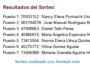 Lista de participantes: 09525481 Antonia Margarita Leon Mendoza, 40404088 Lady Antanette Castillo Lizano, 40221706 Carmen Valeria Campos Napan, 10436795 Yvony Esther Ruiz Torres, 09526847 Sara Noemi Dominguez Ballarta, 46665250 Katerine Lorena Saavedra Alvarado, 15427747 Rebeca Isabel Diaz Huapaya, 44380815 Lisbeth Arimuya Padilla, 10499263 Liliana Paola Chumpitaz Alor, 74872730 Angie Estefani Pardo Herrera, 40275772 Vilma Gomez Aguilar, 15453433 Maria Marcela Camacho Jara, 10241363 Carmelina Flora Barrientos Torobisco, 10744165 Nelly Yanet Linares Chavez, 72808407 Milagros Tefila Guevara Vsquez, 41831235 Juana Castro Espinoza, 47799667 Johana Patricia Montoya Yataco, 10210965 Noemi Castillo Coronel De Galle, 04351949 Nazaria Sullca Quispe, 10226634 Elena Magay Zavaleta Diaz, 71791078 Anabel Escobar Soto, 43368144 Rosaura Paredes Huerta De Toledo, 10209259 Giovanna Yrene Cabello Campos, 76569805 Kasandra Stefany Ramos Perez, 05224008 Juana Rojas Rojas, 07889383 Lourdes Soledad Montoya Romero, 06070977 Zoila Rosa Bracamontes Borja, 41090106 Mariela Marquina Ramos, 41387165 Juana Perez Rojas, 10498702 Marina Genoveva Lopez Naupari, 07896126 Felicita Natividad Arias Espinoza, 09522194 Justina Milagros Chumpitaz Rueda, 07889596 Guillermina Rios Gonzales, 09680626 Yannet Magaly Chavez Quiroz, 44000377 Milagros Evelyn Garcia Anton, 16595203 Paulita Mechan Tullume, 41069627 Melissa Cristina Elias Pacheco, 07688055 Natalia Claudia Azabache Solorzano, 74910345 Paola Cristina Bruno Mendoza, 44035500 Patricia Lanazca Gil, 60074649 Joselyn Estefany Andia Ramos De Jayo, 42057797 Carla Luisa Lira Huapaya, 07998206 Elvira Elizabeth Vasquez De Bermudez, 43768191 Geovanna Edith Diaz Chuavizuta, 70387610 Maria Vanesa Martinez Vasquez, 22097587 Aymee Julisa Navarrete Rodriguez, 73494988 Melanie Gianella Aguirre Huapaya, 29367414 Flora Ruth Barraza Arispe, 40858745 Ana Katiuska Braga Lopez, 46650511 Eleida Maribel Paniagua Mendez, 03352926 Praccedes Julio Pacherrez Feria, 40411507 Maximo Renato Montoya Martinez, 70340197 Flor Maritza Poma Rivas, 80621138 Janeth Capa Ponce, 45498398 Tania Soria Jump, 43935641 Laura Janet Huapaya Villarrubia, 41822449 Erika Zenaida Hurtado Nunez, 42539929 Dario Crisanto Lliuya Roa, 70341819 Almendra Jeraldin Orellana Ramirez, 44335708 Elizabeth Joanna Diaz Chumpitaz, 30953523 Nicolaza Huanacchire Paniura, 72269846 Carolina Miriam Adriano Pimentel, 00090304 Kila Rodriguez Pacaya, 10211038 Marlene Victoria Alejos Gutierrez, 07894385 Rocio Luzmila Camacho Quispe, 72525493 Alexandra Reano Davila, 15401324 Gloria Liliana Ruiz Zambrano, 07691106 Luisa Pajuelo Ramos, 78887499 Rubi Llamoca Infanzon, 77292186 Antonia Isabel Chumpitaz Sanchez, 07890334 Flor De Maria Villafuerte Batallanos, 48795028 Luis Miguel Mendoza Amaya, 42265720 Luis Alberto Silverio Sanchez, 43450081 Lisbeth Jheymi Huaman Garcia, 40951594 Maria Esther Sotil Ramos De Rueda, 70933152 Nancy Elena Pormachi Lliuyacc, 42739851 Victoria Angelica Guevara Vasquez De Farias, 45866073 Josue Daniel Yanac Caycho, 09934722 Humberto Diaz Santa Cruz, 07421393 Carmen Ana Castro Banbaren, 15427436 Nancy Margarita Arias Huapaya Decamacho, 46723106 Susan Abigail Chavez Santamaria, 47766542 Edgar Saul Tocra Arroyo, 09525311 Maria De Las Mercedes Orellana Castillo D Torre, 76271480 Rosario Condori Antoniette, 10209249 Veronica Janet Alegre Vilca, 77071078 Linda Rosa Carrasco Castillo, 25499441 Beneranda Hermenegildo De Cunurama, 02822910 Margarita Merino Rodriguez, 73219009 Elizabeth Gutierrez Crispin, 77079760 Karina Lisbeth Hernandez Ramirez, 10499311 Santosa Claudina Pareja Quevedo, 44318705 Lif Vonne Martinez Campos, 43790880 Felix Ricardo Aguirre Villa, 46429329 Rebeca Gayo Fernandez, 41683278 Evelin Judith Caceres Avelino, 07890208 Elizabeth Ignacia Caycho Condori, 75999512 Jhulia Torrejon Melendez, 74390559 Pablo Cesar Nahui Alcarraz, 40611278 Alberta Corne Lorenzo, 73813504 Norma Elena Llihua Quinte, 09285049 Bethsabe Cordero Anicama De Vilca, 18899160 Ana Cecilia Valencia Gutierrez, 43940110 Ulises Yarleque Ipanaque, 71061675 Carlos Antonio Babarczy Ysmodes, 10103148 Elisa Tenorio Sacramento, 07895210 Maria Virginia Arias Espinoza, 60257930 Estela Campos Farfan, 43242323 Katherine Sindy Cardoso Leon, 07888222 Ignacia Emma Mendoza Malasquez, 08677182 Omar Santos Quiroz Chavez, 09126729 Bertha Beatriz Barrientos Anyosa, 40585590 Elizabeth Ruiz Caycho, 74220967 Jacquelin Rossy Vazquez Caycho, 08181600 Sonia Isabel Ramirez Huambachano, 07999259 Sara Luz Ayllon Castrillon, 40382588 Washington Mayhua, 46037411 Maria Luisa Quispe Condori, 46840321 Katherine Arenas Flores, 07697351 Clarisa Egliceria Gomez Mejia De Ramos, 62815127 Mariana Milagros Del Aguila Ferreira, 29616256 Jimmy Angel Montoya Neyra, 07893456 Maria Del Pilar Garcia Caycho, 08181664 Ana Betha Lizano Cano, 47008663 Daniel Tello Perez, 41574315 Corina Esperanza Cholan Mendoza, 44509673 Yessica Yolanda Perez Gonzales, 44107411 Alfredo Alfredo Castillo Silva, 40519090 Yohanna Rosario Anyosa Vasquez, 10046524 Elena Yovana Requis Perales, 47471590 Karen Neiri Diaz, 002194078 Jose Manuel Rodriguez Blanco, 49007019 Gloria Stefany Arrazaba Villalobos, 43880282 Luis Arnaldo Neciosup Vasquez, 44315345 Yovany Esteria Adrianzen Cruz, 70203023 Stefany Ruth Aranda Quispe, 45802217 Yanina Elizabeth Timana Aguirre, 76098343 Jennifer Ariana Cabanillas Vidal, 46981866 Juan Jesus Almeyda Alquizar, 71882176 Isolina Yaneth Chumpitaz Flores, 47292907 Junior Manuel Yengle Ramos, 74254957 Liz Cristina Perez Martinez, 40164048 Flor Maria Fernandez Cornejo, 41806967 Alicia Elvira Ramirez Sotelo, 70144687 Angie Alexandra Zapata Broncano, 70388904 Noemi Delgado Tineo, 10115756 Nolbertha Hernandez Cuba, 70342450 Karla Guadalupe Zavaleta Ramirez, 40966815 Maria Angelica Espinoza Huaya, 46660847 Jackeline Viviana Aburto Flores, 10499709 Sayda Daysi Gamarra Huapaya, 71662704 Paulo Monterry Paredes, 42270048 Elga Duran Asencio, 07894940 Guisela Ana Maria Garrido Reyes, 42289403 Luisa Ana Zevallos To
