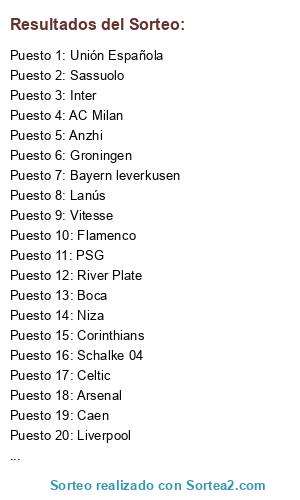 Lista de participantes: Niza, Arsenal, Corinthians, Flamenco, Bayern leverkusen, Boca, AC Milan, Schalke 04, Inter, PSG, Liverpool, Anzhi, River Plate, LOSC Lille, Unión Española, Celtic, Sassuolo, Caen, Oporto, Lanús, Nápoles, AEK Atenas, Vitesse, Groningen.
