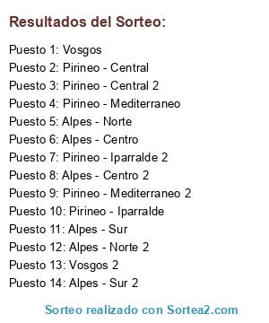 Lista de participantes: Pirineo - Iparralde, Pirineo - Central, Pirineo - Mediterraneo, Alpes - Sur, Alpes - Centro, Alpes - Norte, Vosgos, Pirineo - Iparralde 2, Pirineo - Central 2, Pirineo - Mediterraneo 2, Alpes - Sur 2, Alpes - Centro 2, Alpes - Norte 2, Vosgos 2.