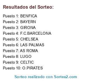 Lista de participantes: GIRONA, BAYERN, CHELSEA, AS ROMA, LUGO, LAS PALMAS, F.C.BARCELONA, CELTIC, BENFICA, O.PIRATES.