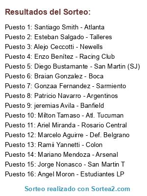 Lista de participantes: Marcelo Aguirre - Def. Belgrano, Alejo Ceccotti - Newells, Ramii Yannetti - Colon, jeremias Avila - Banfield, Diego Bustamante - San Martin (SJ), Ariel Miranda - Rosario Central, Braian Gonzalez - Boca, Enzo Benítez - Racing Club, Gonzaa Fernandez - Sarmiento, Milton Tamaso - Atl. Tucuman, Patricio Navarro - Argentinos, Jorge Nonasco - San Martin T, Santiago Smith - Atlanta, Angel Moron - Estudiantes LP, Esteban Salgado - Talleres, Mariano Mendoza - Arsenal.