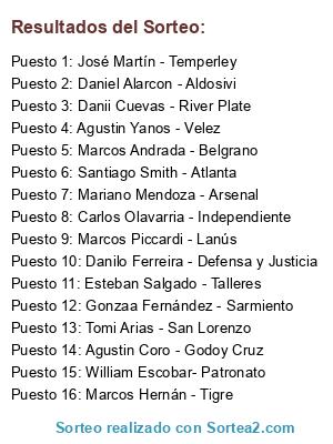 Lista de participantes: Esteban Salgado - Talleres, Danilo Ferreira - Defensa y Justicia, Mariano Mendoza - Arsenal, Gonzaa Fernández - Sarmiento, Agustin Yanos - Velez, Santiago Smith - Atlanta, Marcos Hernán - Tigre, Tomi Arias - San Lorenzo, Daniel Alarcon - Aldosivi, Marcos Andrada - Belgrano, William Escobar- Patronato, Danii Cuevas - River Plate, Agustin Coro - Godoy Cruz, Marcos Piccardi - Lanús, José Martín - Temperley, Carlos Olavarria - Independiente.
