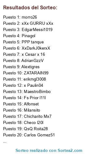 Lista de participantes: Chuy Rys, Chicharito Mx7, Milansito, VpS Gallito, XxDarkJ0kerxX, Carlos Gomez51, xXx GURRU xXx, x Paulin04, VL4 santi2003, RAUL2417, PPP tanque, Fs Prior l11l, MaestroBimbo, x Cesar x 16, Alextigres, morro26, Checo l20l, QsQ Roita28, EdgarMessi1019, erikmgl3008, Alfonset, AdrianGzzV, Pinagol, ZATARAIN99.