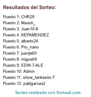 Lista de participantes: Admin, alberto24, KEPAMENDEZ, pablgarcas2, miguetr9, juanje69, CHR29, Pro_nano, Masoh_, show_tankesito-7, Juan10-8, EDW-7-ALE.