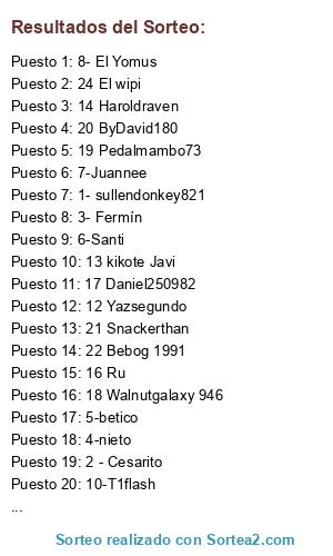 Lista de participantes: 1- sullendonkey821, 2 - Cesarito, 3- Fermín, 4-nieto, 5-betico, 6-Santi, 7-Juannee, 8- El Yomus, 9-maxi, 10-T1flash, 11 Sebastian genio, 12 Yazsegundo, 13 kikote Javi, 14 Haroldraven, 15 j.sego, 16 Ru, 17 Daniel250982, 18 Walnutgalaxy 946, 19 Pedalmambo73, 20 ByDavid180, 21 Snackerthan, 22 Bebog 1991, 23 Julianstv8211, 24 El wipi.