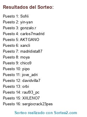 Lista de participantes: AKTGANO, yin-yan, xancli, jove_adri, gonzalo.r, pipo, raul93_pc, sergiocrack23pes, carlos7madrid, madridista87, davidvilla7, moya, XIILENO7, chico9, SoNi, orbi.