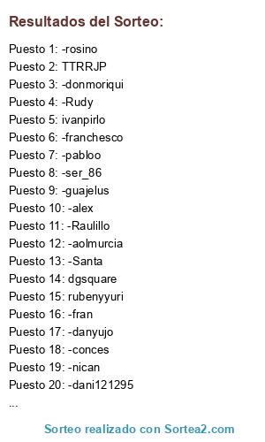 Lista de participantes: -fran, dgsquare, TTRRJP, rubenyyuri, ivanpirlo, zua lega, -danyujo, -Santa, -guajelus, -aolmurcia, -conces, -xxZuaxx, -Martin, -dani121295, -nican, -pabloo, -Rudy, -ser_86, -yandrak, -alex, -Raulillo, -franchesco, -donmoriqui, -rosino.