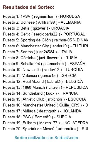 Lista de participantes: Schalke 04 ( gcamachop ) - ESPAÑA, Celtic ( sergioparla22 ) - PORTUGAL, Fulham ( Mexes_77 ) - INGLATERRA, Sunderland ( kuox ) - FRANCIA, Udinese ( Arkhan99 ) - ALEMANIA, Málaga ( deathgoth ) - HOLANDA, Santos ( juan24584 ) - ITALIA, Real Madrid ( kabrel2 ) - BELGICA, Córdoba ( javi_flowers ) - RUSIA, Betis ( qazwer ) - CROACIA, PSG ( Eomer89 ) - SUECIA, 1860 Munich ( citizen ) - REPUBLICA DE IRLANDA, Newcastle ( vertov12 ) - TURQUIA, Spartak de Moscú ( arturoultra ) - SUIZA, Sporting de Gijón ( raimon-05 )- DINAMARCA, Athletic Club ( rrpichon ) - ESCOCIA, Valencia ( ganso15 ) - GRECIA, 1PSV ( regnumllion ) - NORUEGA, Manchester United ( Guille_GR9 ) - DESAPARECIDO, ELIGE CUANDO APAREZCA, Manchester City ( ander19 ) - TU TURNO, ELIGE CUANDO QUIERAS.