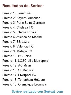 Lista de participantes: SS Lazio, Bayern Munchen, Liverpool FC, Olympique Lyonnais, SL Benfica, Fiorentina, FC Porto, Internazionale, Paris Saint-Germain, Tottenham Hotspur, LOSC Lille Metropole, AC Milan, Atletico de Madrid, Chelsea FC, Valencia FC, Malaga FC.